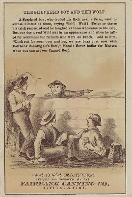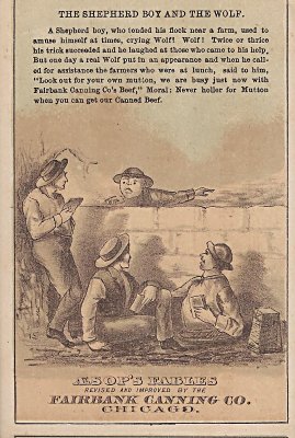 BW is a card poorly cropped by the printer: some of the next card down shows through, and the top margin is not complete here. For that reason, I have been happy to find a better copy and to present it below the original for comparison. In this version, the boy as usual cries "Wolf!" and means it after tricking people several times. They answer "Look out for your own mutton, we are busy just now with Fairbank Canning Co's Beef." "Moral: Never holler for Mutton when you can get our Canned Beef." This card, which may complete the set, came with a number of others from Betsy Cotter, Tonawanda, NY, through eBay, Feb., '12. Better copy for $5.95 from Jacqueline Luzusky, Pinehurst, NC, through Ebay, March, '20.