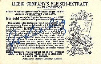 See also the second MSA set (II) from Liebig in 1924. The backs of cards 3 and 4 here have a slightly different format with "COMPANIE LIEBIG" in large capitals at the top, while the other four cards have "VÉRITABLE EXTRAIT DE VIANDE LIEBIG" in smaller caps at their tops. See below the verso of cards #1 and #3 as samples. The fable here is presented not in La Fontaine's fashion, as it is in the 1924 set, but in the more traditional fashion, where first both walk, then each rides, and then both ride. Each card's number, below the picture, also has a sentence describing the scene or emanating from one of its players. The surprising card here is #5, where the men support the front legs of the ass. Then in #6 they carry him on a pole, and the scene's sentence says ""Le plus âne des trois n'est pas celui qu'on pense." The moral throughout is "On ne peut contenter tout le monde et son père." The cartoon figures here are the kind that people from Milwaukee see on the walls of their German restaurants. The miller smokes a German pipe throughout. The artist is of course ingenious in positioning a container of Liebig's meat product somewhere in each scene. Now, eight years later, I am happy to have found the German set too. The only difference I notice among the versos of these German cards lies in the degree of bolding given to the top line. These cards are so lovely that I reproduce each in larger-than-life dimensions. Click on a small version to see it.