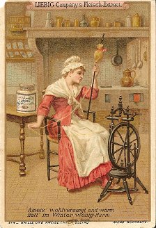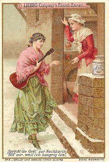 Each scene puts a can or jar of Liebig's meat product in one of the lower corners. The last two cards I had already found advertising Aux Deux Passages in Lyon. As I comment there, I have never before seen the ant dance, supposedly in mockery of the cicada, as the former sends away the latter.