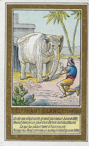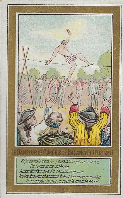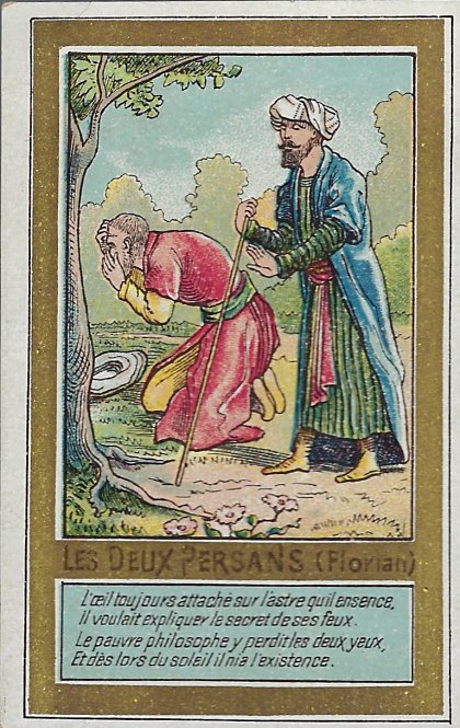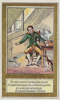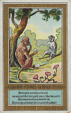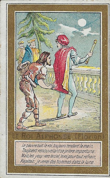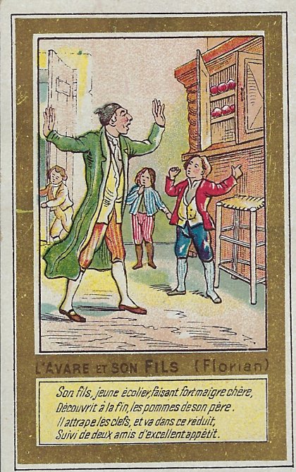 1890? 13 colored French cards (and one extra) picturing scenes from Florian's fables. 2½ " x slightly more than 4". A Billon, Paris. $70 from Bertrand Cocq, Calonne-Ricouart, France, March, '01. "La Guenon, le Singe et la Noix" and extras of "Roi Alfonse" and "L'Avare et son Fils" for €15 in St. Ouen, June, '19. $5 additional cards, presented here at the top of the table, for $5 each from Bertrand Cocq, Calonne Ricouart, France, Sept., '20. Three more cards from Albert van den Bosch for €20 each, Jan., '23.