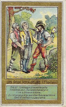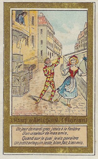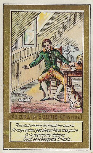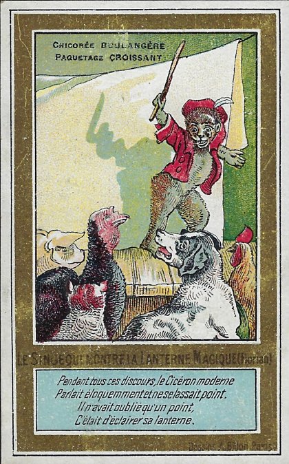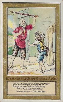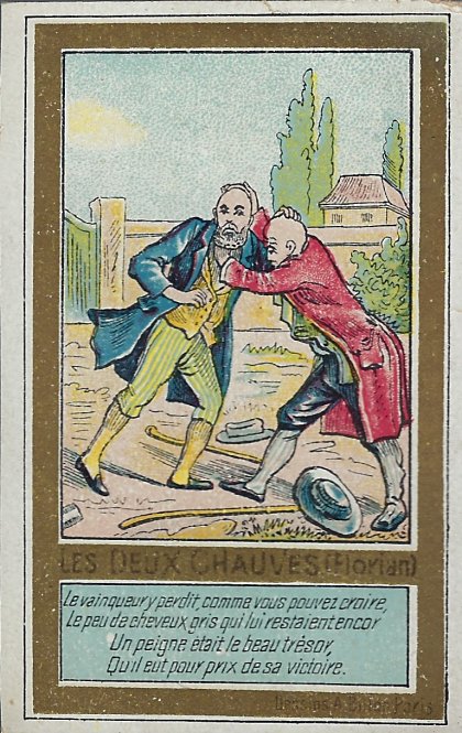 In these portrait-formatted small cards, a gold border surrounds the full-color picture in the upper three quarters of the card and the five or six lines quoted from Florian below. The title of the fable itself, with Florian's name in parentheses, is written across the golden bar separating the two portions of the picture side of the card. The monkey giving the laterna magica show cuts a vivid figure. Another striking image is presented by the two bald men grappling with each other. If one exchanges gold borders for blue, these cards are almost identical with those which I have listed under "Florian Blue Border." Four cards advertise "Chicorée Boulangère/Paguetage Croissant" on their picture side, while one advertises "Chocolat Ibled". All five of those cards have consistent advertising on their text sides. Four cards advertise Moka Beriot from Lille. One advertises Maison Salmon L. Tual-Salmon as a maker of chocolates and "conserves alimentaires." Two cards present short fable texts and advertise "Chicorée Extra a 'L'Écolière.'" Two cards simply present the fable text and refer to a second printer, A. Picard et Kaan. The most recent cards from Bertrand all advertise Beriot of Lille on the verso, two for their "Moka" and three for their "Chicorée Orientale."