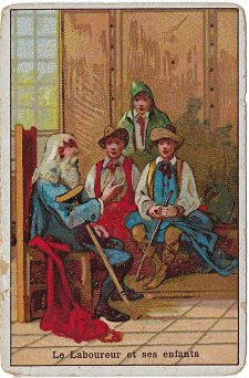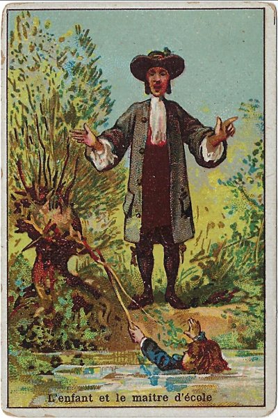 Several of these designs appear on papers and cards listed under "Leopold Verger-Chicoree Haquet" and, among chocolate and chicoree cards, "Maison Salmon." And two listed there actually are identical cards with this set. Bertrand describes them as "Babotte," but I can see indications only of Picard. It is true that our collection includes several cards from "Alph. Babotte," and the images are those of this group. One of my favorite Paris used bookshops is Librairie Picard. I wonder if there might be some connection. The verso in each card is given only to the text of La Fontaine. There is no further advertising