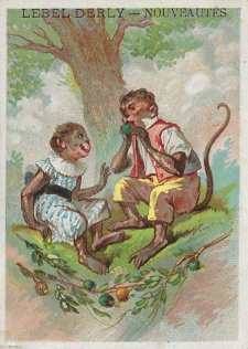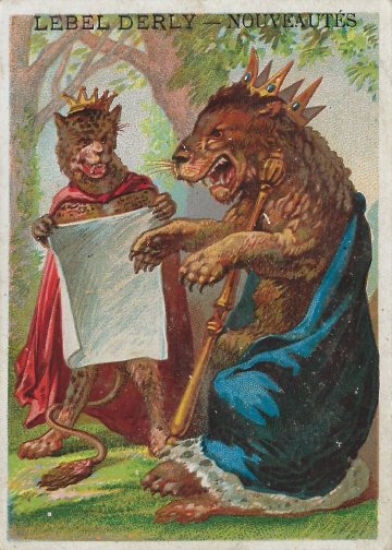 The first six from Clignancourt are cropped. At present I have full versions of all seven cards except "Le Lion et le Léopard," for which my only examplar is cropped. How wonderful to have something from an institution like "Aux Deux Magots" right at St. Germain des Pres! The colors are strong and the animals well dressed. Most humans would need a magnifying glass to read these fable texts! They were kept deliberately small, one suspects, to make room for the advertiser's information. "La Guenon, le Singe et la Noix" may have the strongest illustration of the lot. The printer for both LP and ER is "Publicité Roussette, 65 Faub. St. Denis, Paris, while the printer for AQF and ADM is "Ass. d'Ouv. lith., Romanet et Cie, 27bis, r. Corbeau. While some cards have only the image on one side and the text of the fable with its title on the other, the other cards represent several advertisers.
