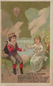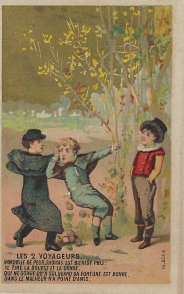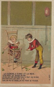 The Rodrigues set has no advertising on its illustrations, blank banks, and good condition. A golden sky marks each of these cards. Children act out scenes from La Fontaine's fables, from Florian's "Le Chien Coupable," (5.17), and from someone's "Le Chat et le Moineau." GA is a slightly different approach to the usual French presentation of this fable, perhaps since the actors are children. The music-player here is a young boy, and he has a violin rather than the usual guitar. Part of the cards' fascination seems to lie in dressing the children up. "Le Gland et la Citrouille" here introduces a second character. Is a smart young man explaining to a young woman that there are reasons why acorns should go with oaks? Is that candy that the little girl in FC has in her hand? How well does this illustration work on a card that ends up advertising chocolate? The script here is all capitals. Of the other cards than Rodrigues', four cards have "Bonbons Gramont" imprinted on the front ("Seul Rem ède efficace contre la Toux"!). Their backs have a uniform brown-ink advertisement for Bonbons Gramont. Three have "H 597 a" printed on the picture side, and the other has "H598 b." Two cards have "Chicorée Indigène/Arlatte & Cie, Cambrai" printed on the front. They both have "H 597 a" printed on the front, and they have a uniform black-print advertisement for the product on the back. Two cards have nothing stamped on the front, have one each "H 597 a" and "H 598 b" on the picture side, and offer a uniform advertisement in black ink on the back for Chocolaterie de l'Eure, à Menilles près Pacy-s/-Eure. Finally, the cropped card, like its larger version, has "H 597a" on the front but has no other markings, front or back. For an even fuller selection of these cards, consult Debauve & Gallais Cholocoate Cards.