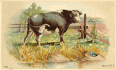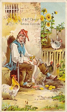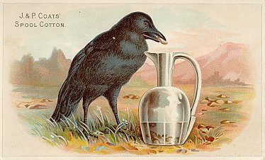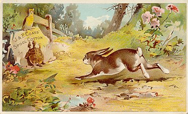 1885? 8 colored cards (apparently from a series of 8) used for J. & P. Coats Spool Cotton (unnumbered, with advertising and the fable text in various formats on the back), McPhail Pianos (each marked with the same simple number "32" and only the fable text on the back), Emerson Pianos, Eureka-Maryland Assurance and other advertisers (with various numbers introduced by "No."). Some also appear blank. 3" x 5". Multiple copies of each card, and reverses of three, as seen below. Between $3 and $12.50 from various dealers. There is an advertising booklet for Wright's Indian Vegetable Pill Company that uses seven of these eight fables and their illustrations, excluding only CP. Curiously, I purchased a set of seven "J.P. Coats" cards from Sherry Sonnett, Los Angeles, in May, '11, and CP is again the one missing card. |