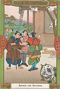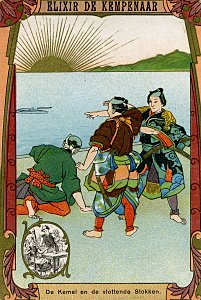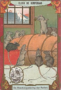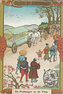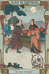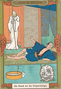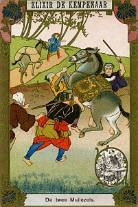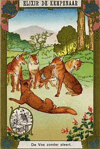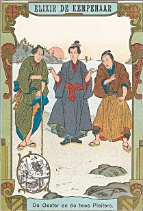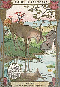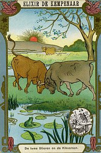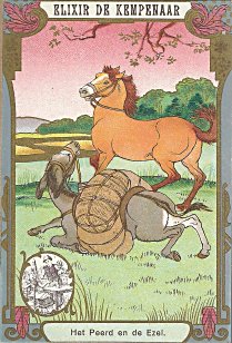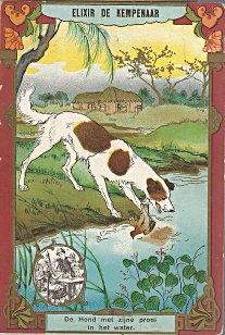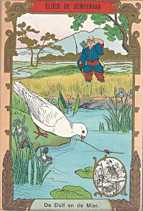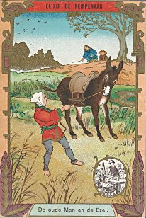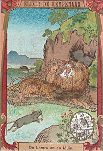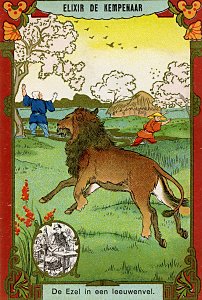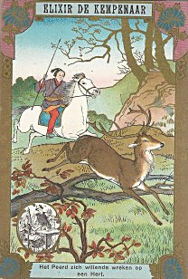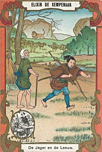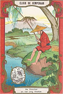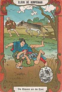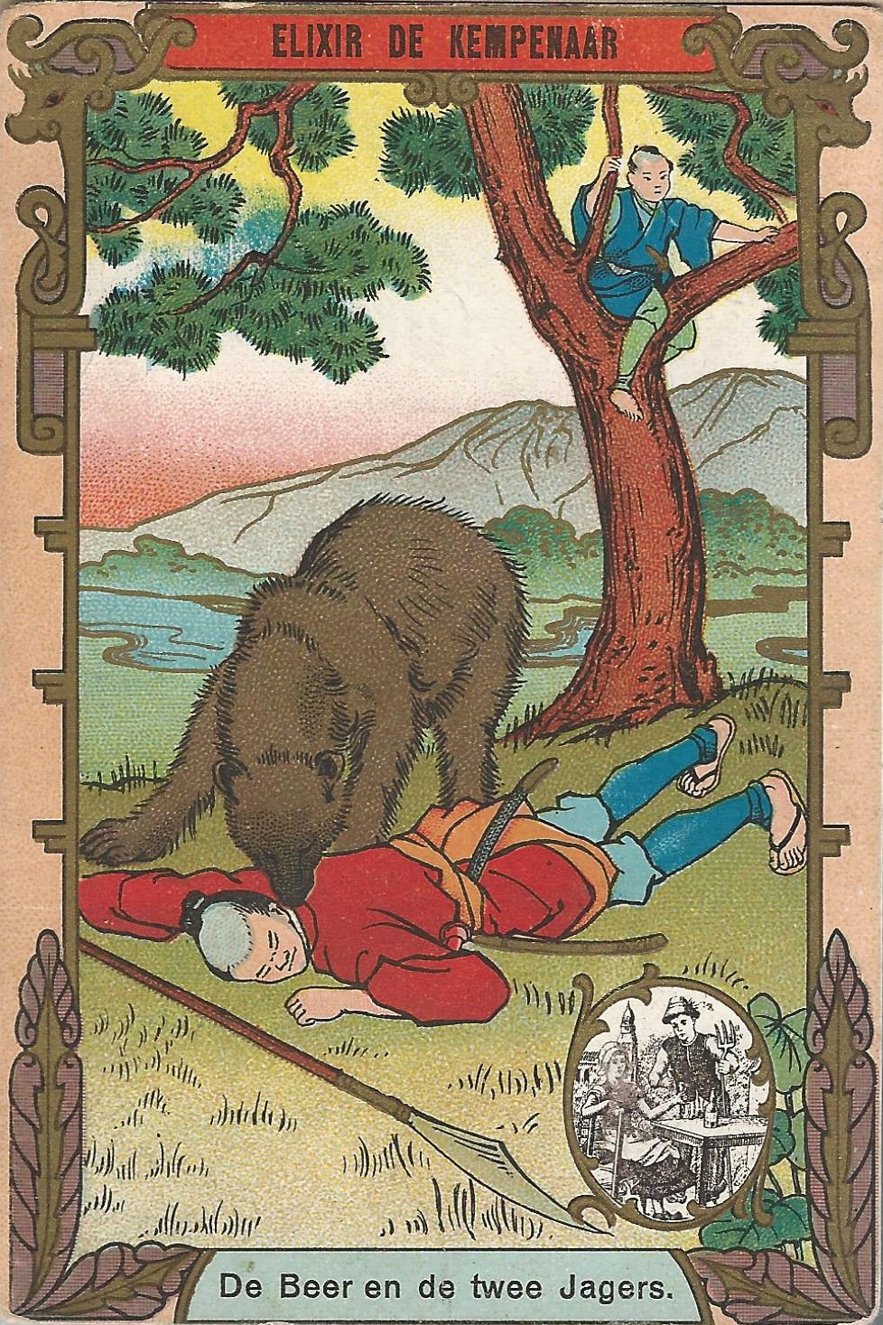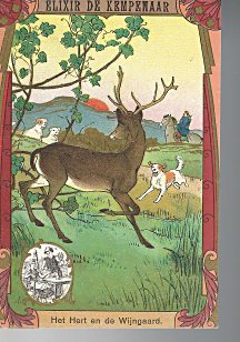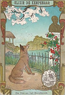 1900? 24 out of a series of 24 cards presenting fables of La Fontaine in an oriental style with Dutch text of the fable on the verso. "Elixir De Kempenaar." Druk J.E. Goossens, Brussels.