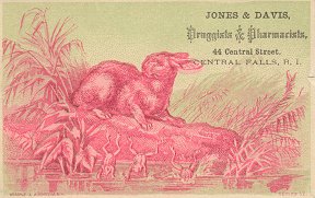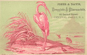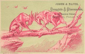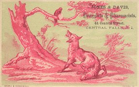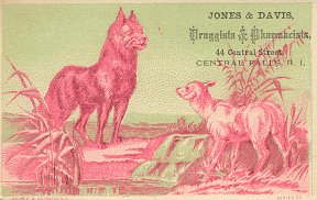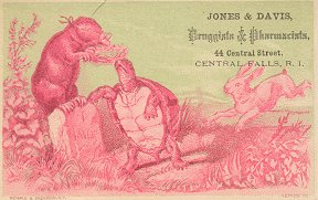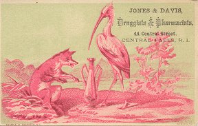 1880? 8 cards (from a set of 12?) fable-illustrated stock trade cards lithographed in pink and green by (Charles) Wemple and (Martin) Kronheim of NY. Each card is signed "Wemple & Kronheim" and advertises Jones & Davis, Druggists & Pharmacists, 44 Central Street, in Central Falls, RI. $30 from Paul at Rummage-O-Rama, West Allis, Feb., '98.