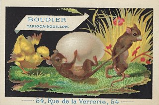 1890? One colored small card (2½" x 3¾") advertising Boudier "Pates Alimentaires" and showing two mice with an egg. €5 in St. Ouen, June, '19. The color work in this card is exceptional. Boudier claims awards 1867-1878. The image is a clear reference to the two mice or rats with an egg, but what is the chick doing in the picture? Advertising on the verso. No reference to La Fontaine or the fable. |