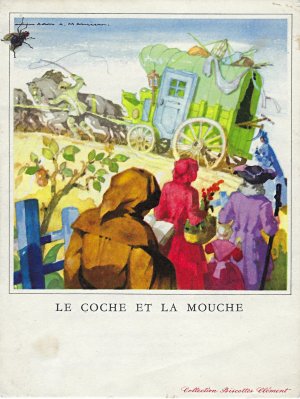 1960? Colored fable card advertising "Collection Biscottes Clément" and presenting "The Coach and the Fly" by Jean Mercier. $3.36 from Jeannick Brisson, Baignes Sainte Radegonde, France, through Ebay, May, '20. I recognized this image immediately. It was done by Jean Mercier and appeared on menus for Compagnie General Transatlantique. In fact, that menu appeared in the Joslyn Museum exhibit of this collection in 2018. Its most unusual feature is the oversized fly apparently sitting on the paper. The fly is so insignificant, despite his own ideas of his accomplishment, that he does not appear otherwise in the image. One is tempted to whisk him away in order to look at the picture! The printer's name ends in something like "ugges" in Paris and Nantes. In an earlier existence this card lost that bit of its printer's name. The title and text of the fable make up the verso of the card. |