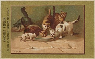 1910? One coloed card advertising Chocolat Poulain and showing an image of cats around milk. On the verso is Florian's fable "Ivy and Thyme." €5 in St. Ouen, June, '19. | |