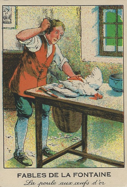 1930? Chromo trade card of GGE. "Fables de La Fontaine. La poule aux oeufs d'or." €4.50 from Helene Baumer, Epinay sur Seine, France, through Ebay, June, '20. This is one of those trade cards with lovely coloring and energetic action, here sadly that of killing the hen. There is nothing I can find on this card to identify who printed it or when.