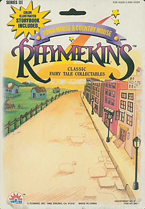 In 1988 and 1989, Funrise marketed as "Rhymekins" in various packaging a number of storybook plastic figurines together with matching storybooks. Some of these are fables, while others are nursery rhymes or fairytales. Maximum height or length 4". Made in China. Except for one, the source is unknown.