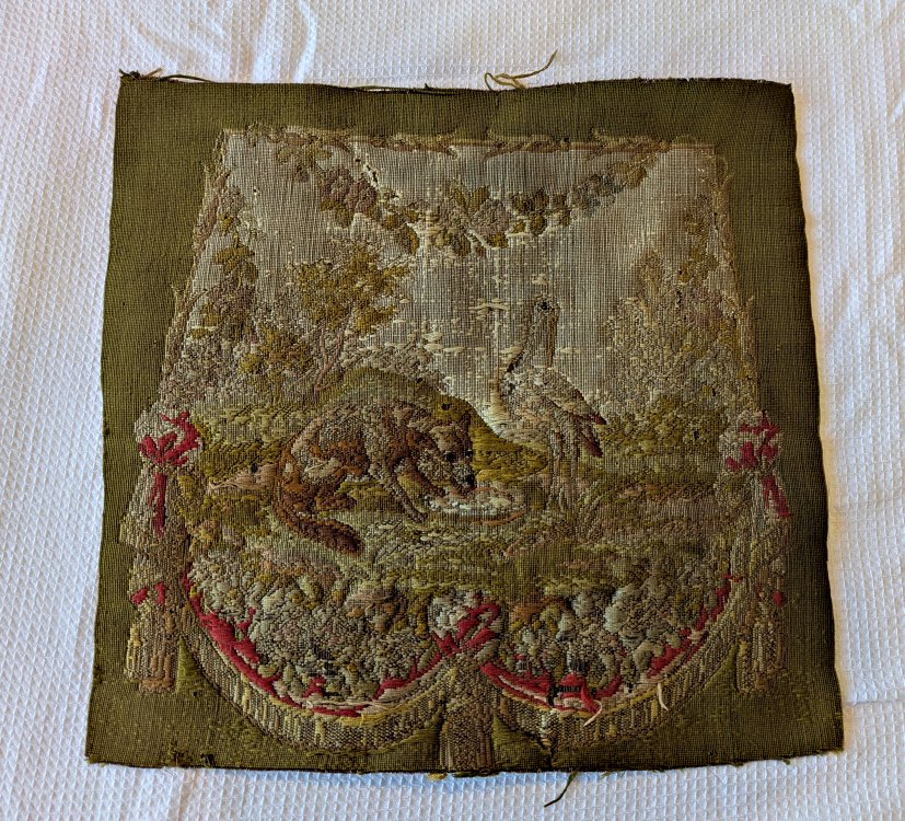 This well-worn piece still has a recognizable scene, with the fox lapping up his thin soup while the frustrated stork looks on, perhaps already planning some payback. Would a piece like this have covered a chair or pillow? Is it, as I believe, deeply worn?