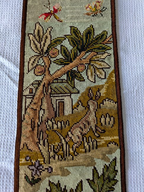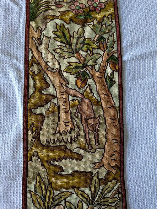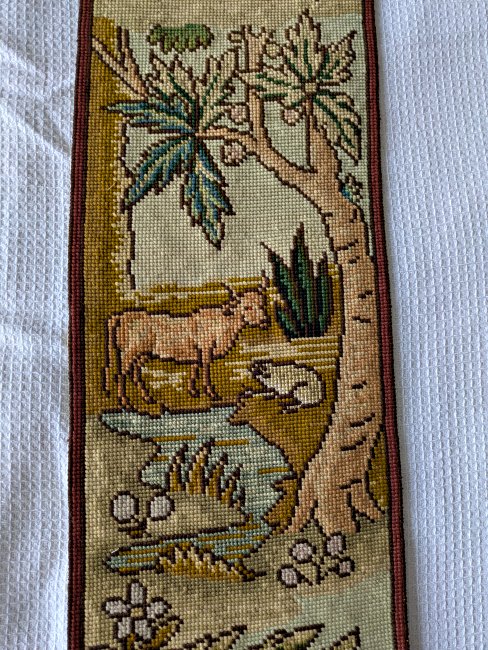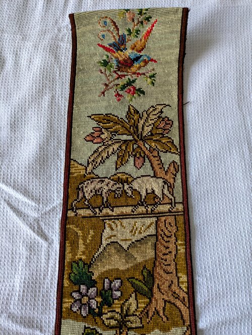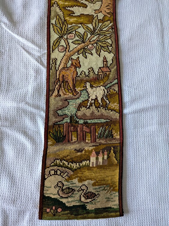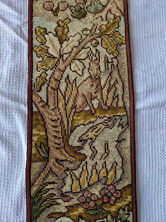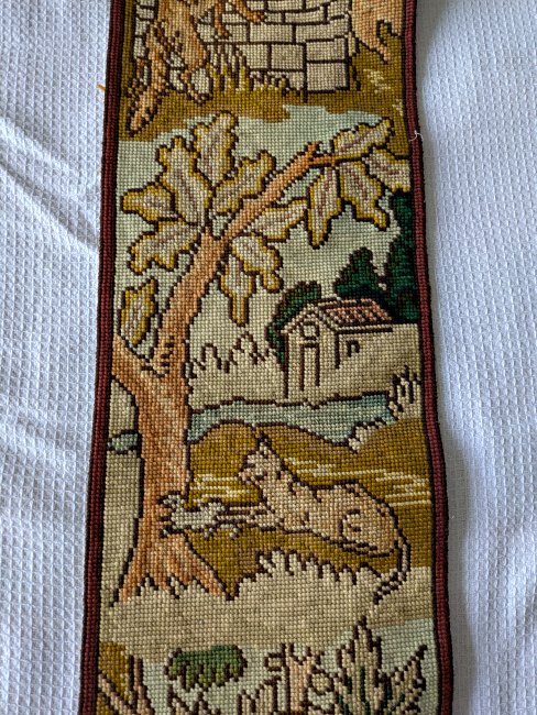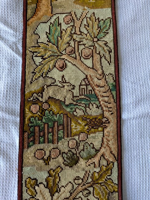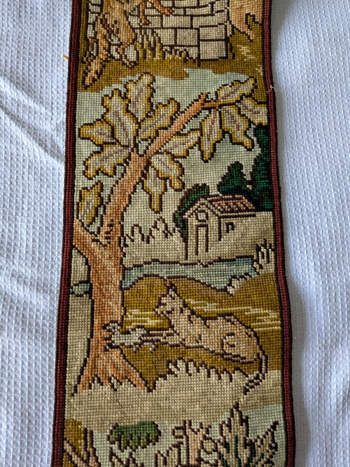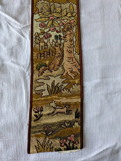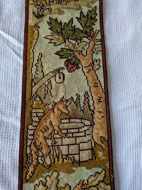 1900? A long tapestry formed from panels presenting seven fables of La Fontaine. About 10' x 18". Backed substantially. Gift of Gay Wirth of Wirthmore Antiques, New Orleans, August, '18.