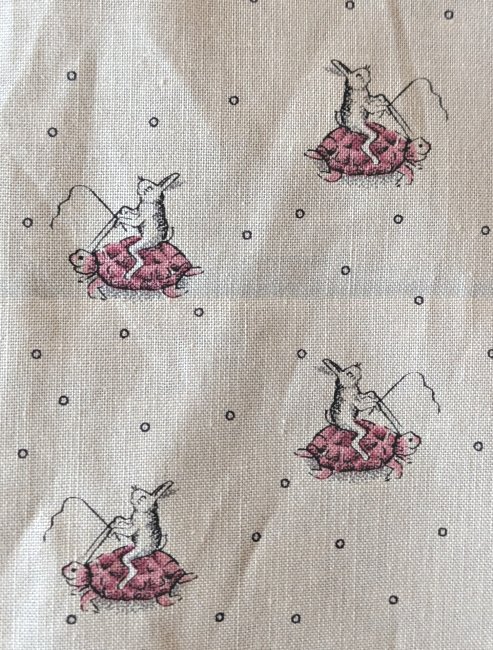 2000? Cloth with miniature hare-riding-tortoise patterns. 22” x 18.5”. Source unknown.