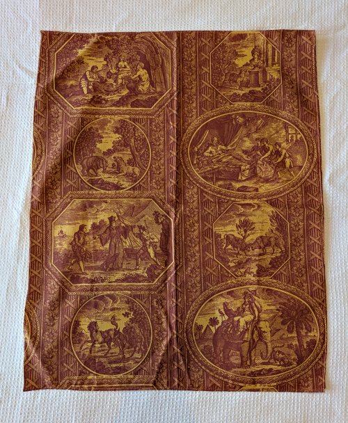 This is a serious piece of cloth and a wonderful addition to the collection! The repeated pattern includes eight fables, four to a column, with one column featuring ovals and hexagons, and the other circles and octagons. The eight fables are, in one column, "Elephant and Pug"; "The Fox and the Bust"; BS; and "Two Bulls and the Frogs." The other column features "The Oyster and the Litigants"; "The Horse and the Ass"; "The Man and the Satyr"; and "The Lioness and the She-Bear." The cloth is beautifully executed and in excellent condition. My guess at its age is pure speculation! My thanks to the seller for providing a rich array of views of this impressive cloth! Click on the cloth to see some various views of this lovely piece!