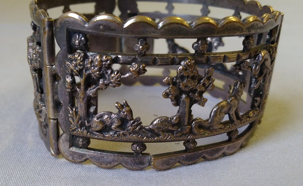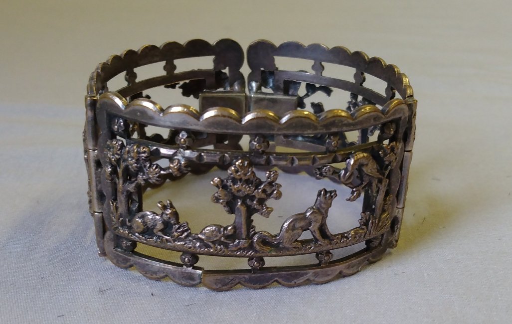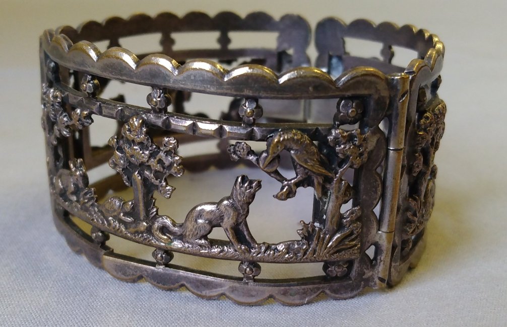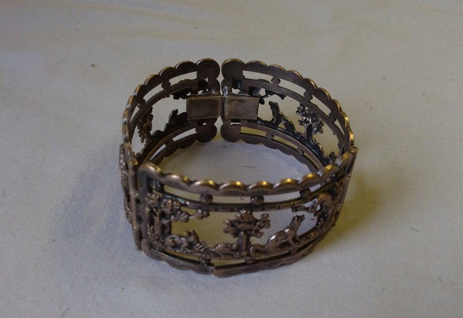This is a gorgeous piece. I have tried to render its detail but fear that I have failed. The bracelet is heavy. Its serious clasp bears, in English, "Made in France." Similar bracelets on the web seem to be in the $200+ range.