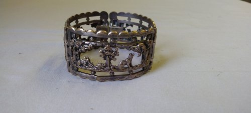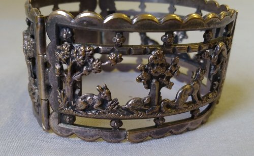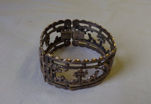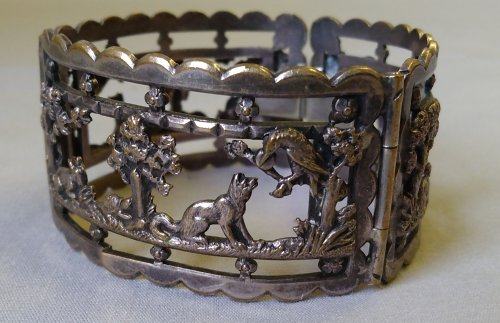 This is a gorgeous piece. I have tried to render its detail but fear that I have failed. The bracelet is heavy. Its serious clasp bears, in English, "Made in France." Similar bracelets on the web seem to be in the $200+ range.