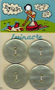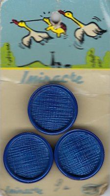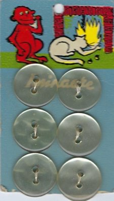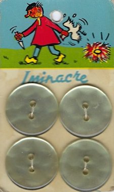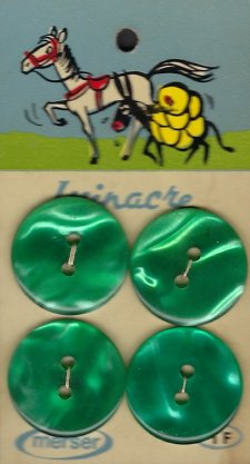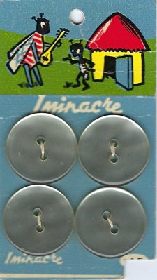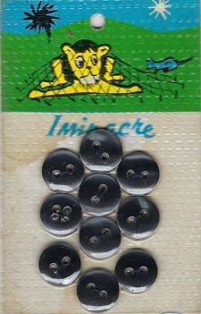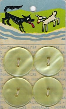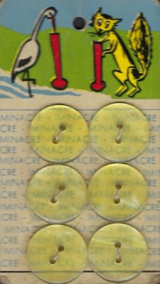 1960? Cards of Iminacre buttons using La Fontaine fable designs. About 2" x 3⅛". Four to six buttons per card. $2.32 per card from Lisagora, Machecoul, France, March, '19. €5 each for GA and an extra of LM from Jerome David, Beauvais, France, through Ebay, Nov., '20. $5.58 for TT with peacock blue buttons from Skopadiddle Vintage through Etsy, Nov., '20 . Six sets, including "Horse and Ass," for $20 from Bertrand Cocq, Calonne-Ricouart, France, Sept. 20. Also included: extras of LM; TT; "Fox and Goat"; "Monkey and Cat"; and "Puss in Boots." Three sets from "la fee chinette, on Ebay, for €3.99 each, including FS and extra copies of "Horse and Ass" and "Monkey and Cat."