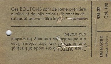 The surprise with these button cards is that the fable illustration – clearly taken from one of La Fontaine's most beloved fables in each case – has nothing perceptible to do with the buttons! The fable is never named. The verso provides either the lot number, always beginning with "975-22" but then varying for two further digits, or these lot numbers plus a short promotion of the buttons in French and English. While cataloguing these seven cards received from Moriceau Esméralda, I found others at two different places on the web and of course several already purchased by other collectors! The hunt will continue.