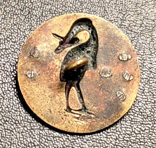 1890? One brass button, 7/8" in diameter, picturing "The Crane and the Fish." $8.33 from Robin Larner, July, '99.