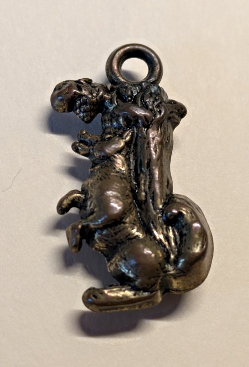 The collection received this charm a long time ago, but we only now are able to catalogue it. As I found it, I wondered why we had a lone tortoise in the collection. Closer examination revealed a hinge, and some patient probing found a way to get it open after so many years of being shut. The smallest rabbit in the world is lodged inside this tortoise! He lives in a lovely pearl-colored casing.