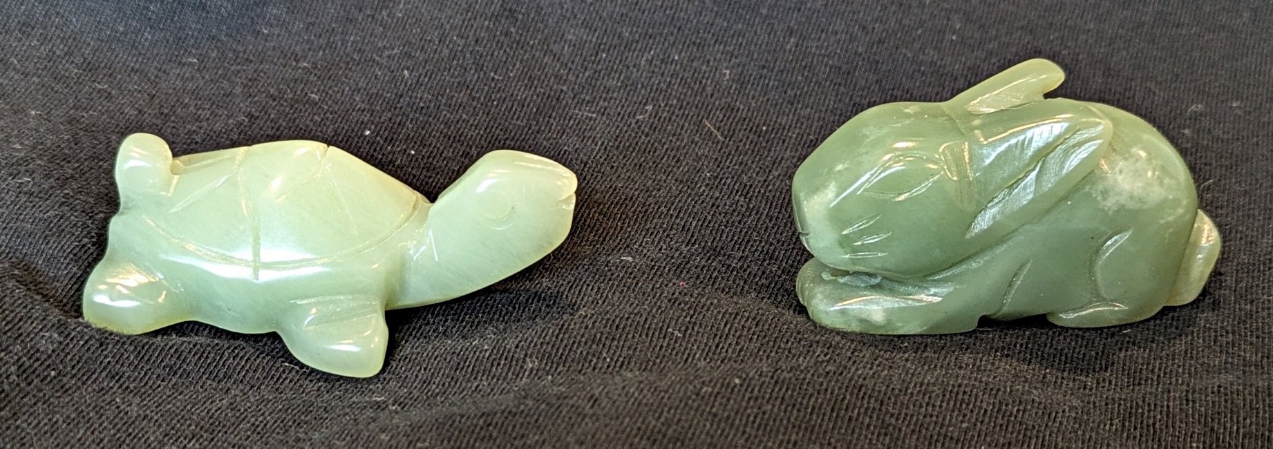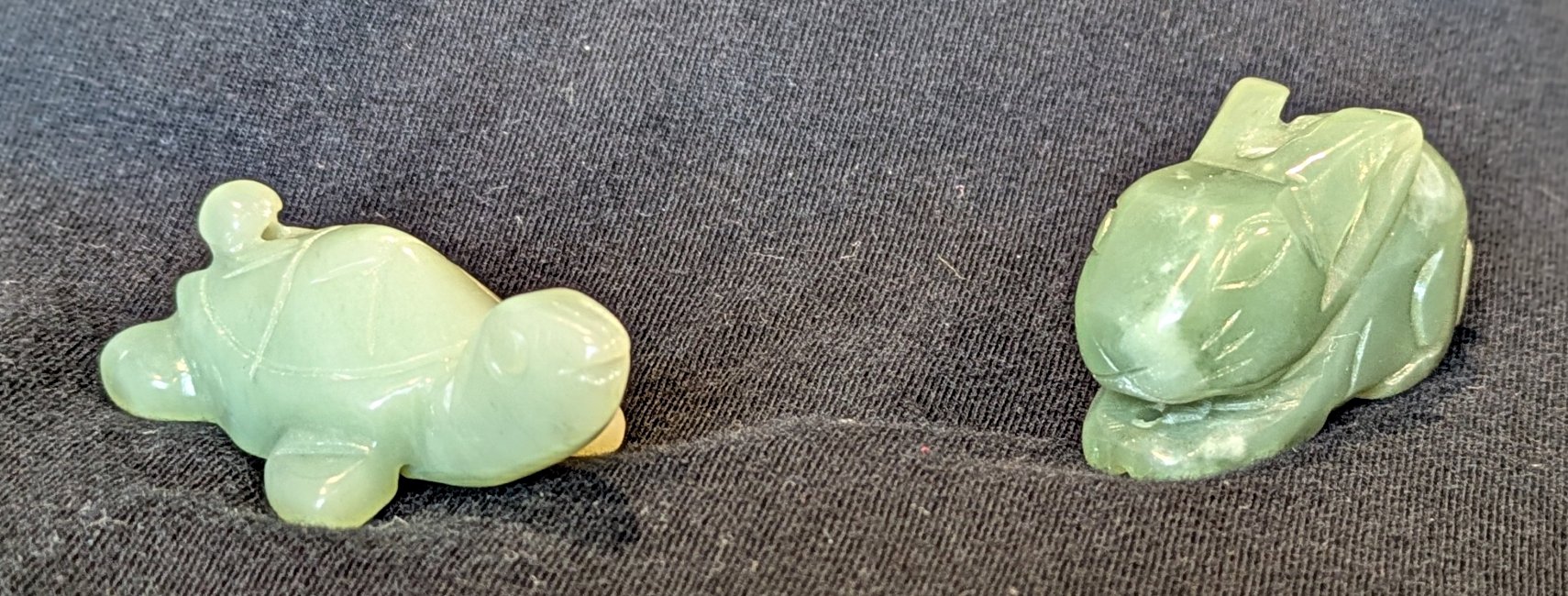 1990? Jade pendant figurines of tortoise and hare. Tortoise 2” in length, hare 1.75”. Source unknown.