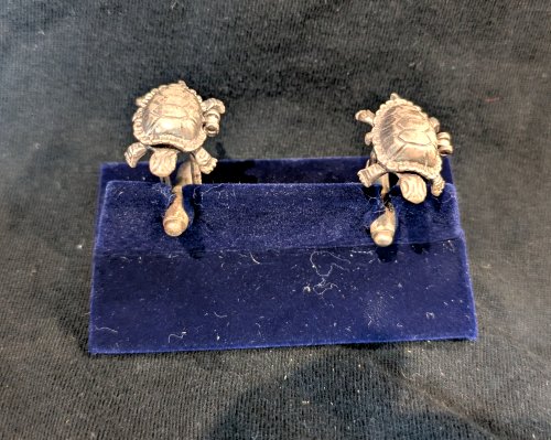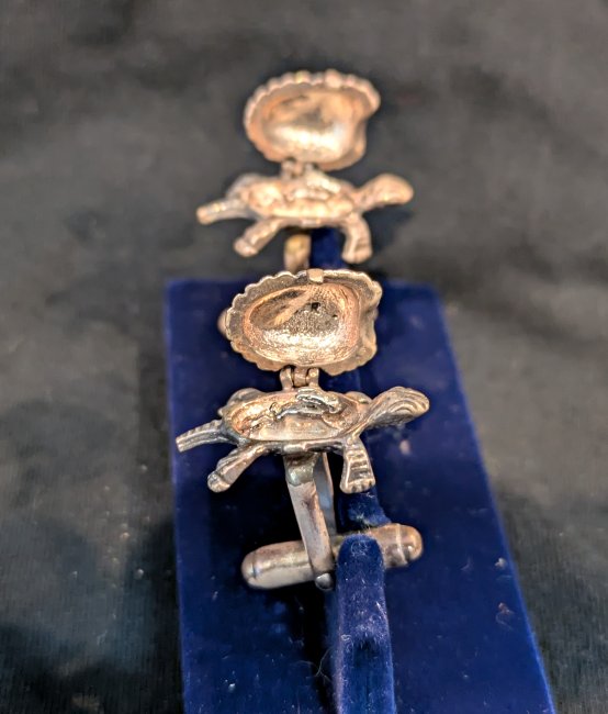 This is some of the most delicate small work in the collection! Each cufflink has a hinged tortoise back. Opening it with clumsy fingers is not easy! Does the Hallmarket Silver box belong to this exquisite pair? And what brings a person to wear openable tortoise-and-hare cufflinks? Matched tortoise cuffliniks seem common enough on the web. I have not yet found TH cufflinks.