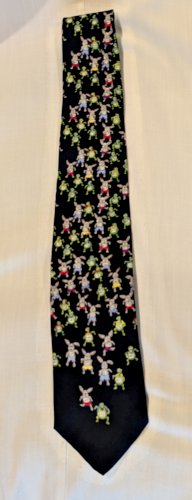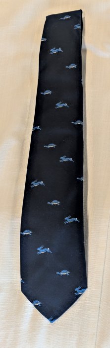 Tortoise and hare alternate in diagonal lines, with just a touch of white to offset the light blue in each animal. Rivetz seems still to be creating neckties. The web knows nothing of the "Sports and Specialties Shop, Inc.," named on a label sewn onto the necktie.