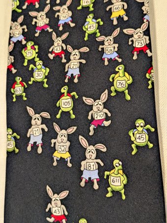 There are lots of tortoises and lots of hares in this marathon! Aesop's story keeps stimulating new ways of thinking and visualizing! Alynn Neckwear is still going, but this ties seems to have gone "out of print." The creator has fun with groups and numbers. I see repeated runner's numbers, but they do not seem to be in the same group as the other appearances.
