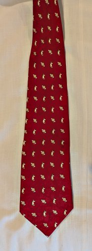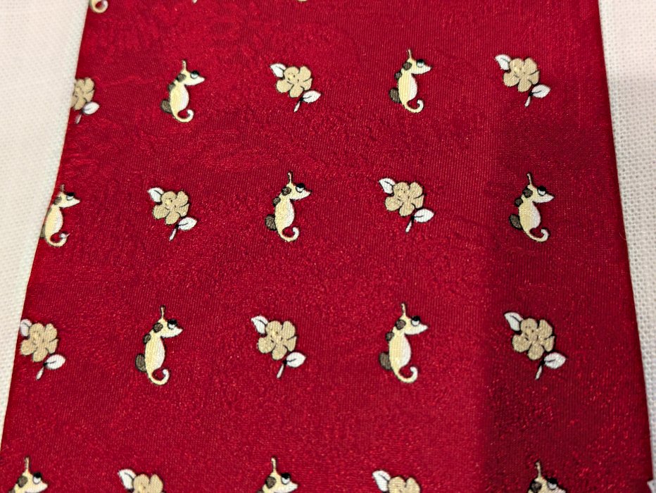 The repetition here is absolute in rather rigid rows. Fox and grapes alternate and then are in the next row in checkerboard alternation. As with other ties, I wonder if there really was an effort to have the viewer take in the specific object presented on the tie. The effect is rather "a red tie with some white markings." In fact, are those grapes or rather leaves?