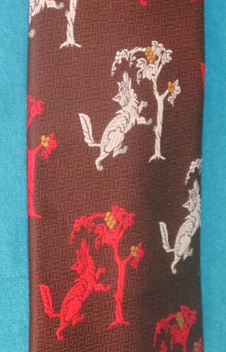 The repetition here is absolute in rather rigid rows. Fox and grapes alternate and then are in the next row in checkerboard alternation. As with other ties, I wonder if there really was an effort to have the viewer take in the specific object presented on the tie. The effect is rather "a red tie with some white markings." In fact, are those grapes or rather leaves?