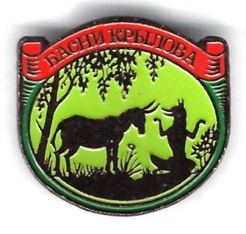 2000? Lightweight Pins of Krylov's Fables: Brown, Red, Green. Three for $18 apiece from Vintage Jewelry Alvina through Etsy, April, '23. "Fox and Ass" for $6 from Little Link Shop through Etsy, April, '23.