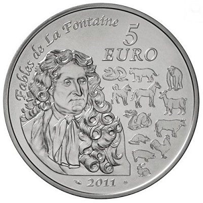 2011 €5 coin commemorating the year of the rabbit. On the verso is Jean de La Fontaine with the 12 animals of the zodiac. $32 from Numest in Estonia through Ebay, Dec. '18.