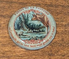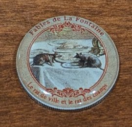 This is something new to me. The verso of each is the same, a representation of "Republique Française," apparently a 1 Franc coin from 1960. The other side is a small -- not quite 1" -- representation of a fable of La Fontaine with its title. These images are so small as to be difficult to photograph well!