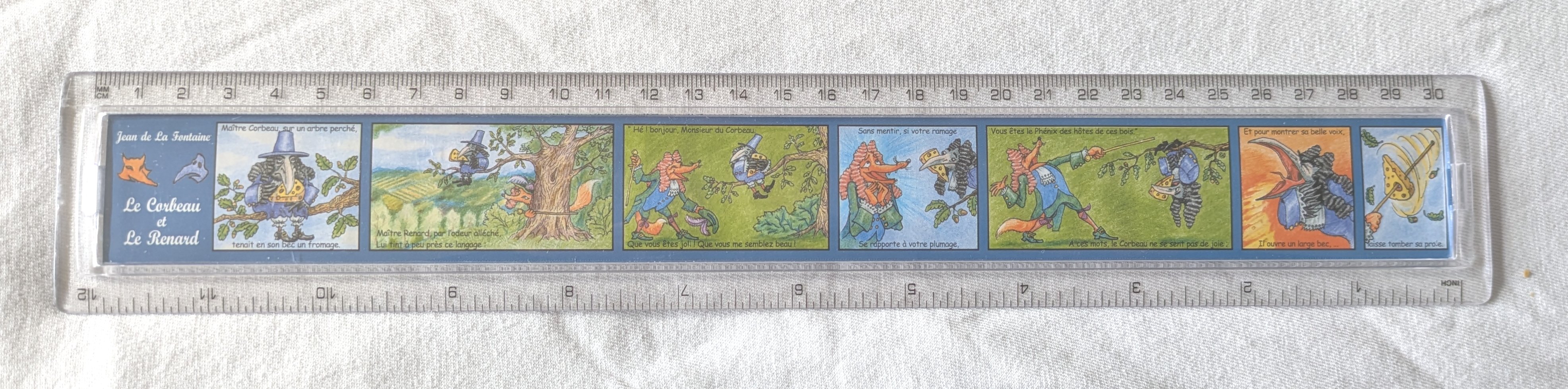 Ten lively illustrations join La Fontaine’s text of FC across the front and back of this plastic ruler. I regret that I cannot find Kiwi’s art for La Fontaine elsewhere. Both of us his characters sport fascinating wigs!