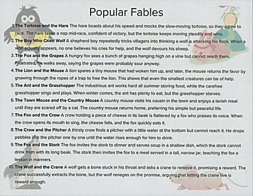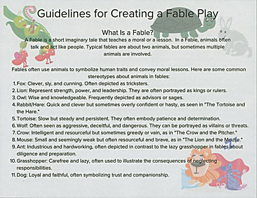 The first side answers “What is a fable?” and gives 11 characters and their characteristics. The verso gives lessons to be learned from fables and an example for each lesson.