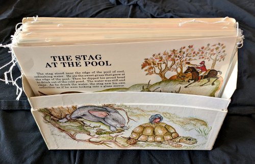 1982 “The World of Fables: Reading Comprehension: Aesop’s most famous tales, with morals that challenge.” 16 fables, each 8.5” x 11” with two or three laminated pages, in a box. $10.55 from Pat Balert, through Ebay, August, ’04.
