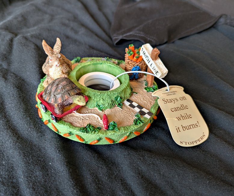 “S’toppers: The Soot Stopper Topper.” “Stays on the candle while it burns!” Tortoise leads the hare as they approach the finish line and its basket of carrots. I am happy to learn that there are candle toppers!.