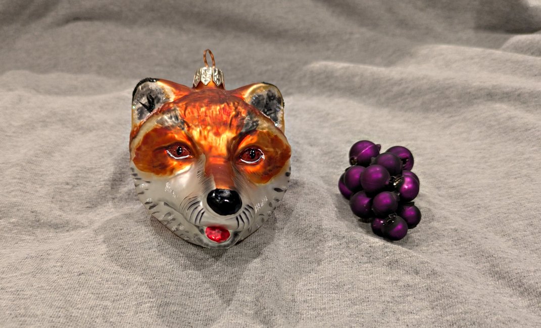 2000? Christmas Tree Ornaments of Fox and of Grapes. Glass. 3" and 2" in length. Gift of Margaret Carlson Lytton, Christmas, 2005.