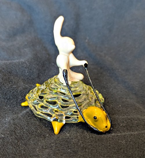 This is a fragile ornament. Both animals have very fine parts that seem as though they could break easily. The ornament features the frequent motif of hare riding turtle; as far as I can tell, this feature has nothing to do with the Aesopic fable, but I have not been able to find its source.