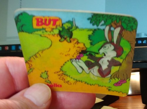 First, I am unsure if these are really coasters. I am not sure what their other use would be. Secondly, the verso says that this is a series of 6 fables. I would love to find the other four! Thirdly, it is hard to show the character of these "visiomatic" scenes, especially because, in these instances, the makers are not completely successful in bringing the whole scope of movement into the normal visual field. Adjusting the angle of vision from up to down reveals the whole scene, for example, of the cheese moving from the crow's beak to the fox's mouth, who eagerly consumes the cheese. Similarly, the tortoise passes by the hare while he is awake, but soon reaches the goal while he sleeps and then awakes with a start. After several attempts, I will here show, quite imperfectly, what the "before" and "after" of each is like in a still photograph. These are better seen in action!