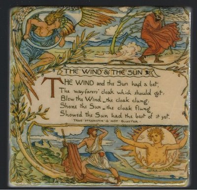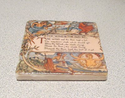 2020 Three ceramic coasters showing three scenes from Walter Crane's Aesop's Fables. Almost 4" square. $29 from The Painted Lily through Etsy, June, '20.