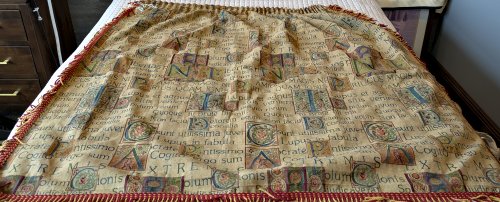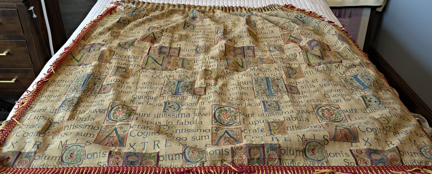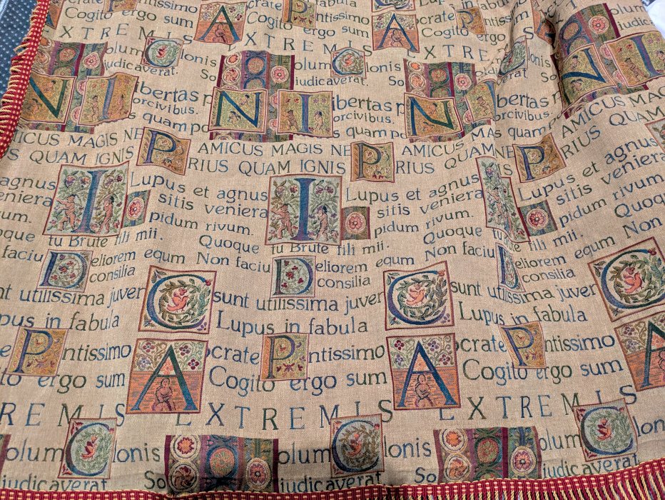 I have found several instances of this heavy material on the web. I will quote one of them since I know little about this material: “baroque style, neo-classical style golden fabric. High quality material. The Latin here is curious. I believe I acquired the drape because I noticed the two phrases above; perhaps I assumed that it was fable texts. It is rather a hodgepodge mostly constituted by frequently cited Latin aphorisms. Two of the easiest to recognize are Descartes’ “Cogito ergo sum” and "Tu quoque, Brute, fili mi." The latter is cited in a less known form that our common “Et tu, Brute.” The standard Latin for WL is “Ad rivum eundem lupus et agnus venerant, siti compulsi.” Other recognizable phrases here are “amicus magis necessarius quam ignis et aqua,” “Socratem iustissimum temperantissimumque omnium Graecorum antiqui existimaverunt,” and "Non faciunt meliorem equum aurei freni.”