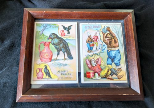 These cards come from the series I have called “German English.” We have five in the series, including “The Trick Bear and the Keeper.” The situation here is different from, I believe, the traditional telling. There the bear and gardener befriend each other. Here one is a circus performer and the other is his trained animal. Apparently the trained animal liked his trainer but lacked an important part of his training! Heavy glass covering the pair inside a heavy wooden frame. The left card is oddly positioned up against the edge of the visible field. Perhaps the two cards got anchored before the framer finished the job.