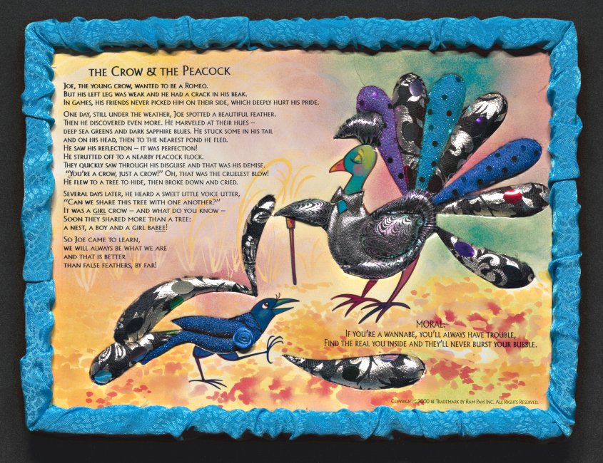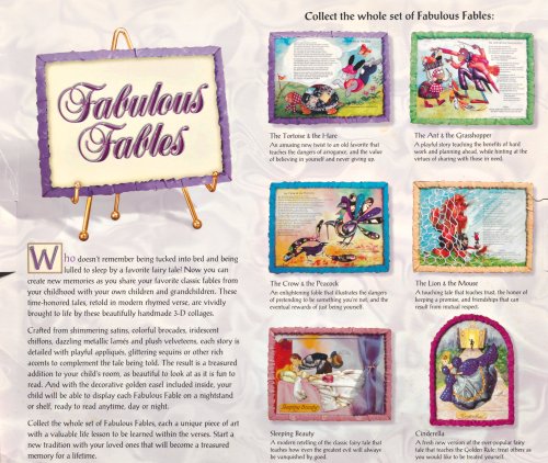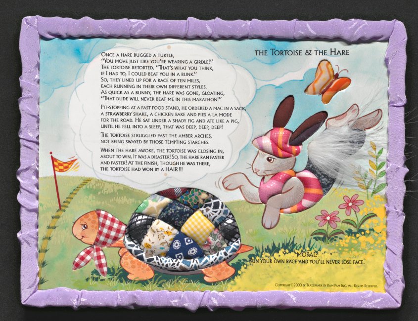 This is an unusual pair. Two other of the six illustrations in the series present fables. All of the six are unusual in that they come with easels; they are a composition of paper and sewn elements; and they present verse texts as a part of their images. The mysteries continue in that Ram Pam seems no longer to exist, and Li-Med is a software company still in Vernon. The images themselves are curious in their combination of colors and compositional materials. The verse itself is rhymed, sometimes a bit forcefully. The race lasted ten miles! The hare stopped and ordered a “Mac in a sack.” Oh, my! And, yes, the tortoise won by a hair. The silver-and-black elements are unusual in BF.