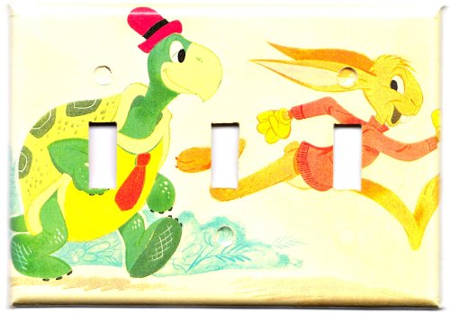 Simple designs allow for the three holes necessary for these switch-covering plates. The racers' path leads to the red flat at the top of the switch. Is that colorfully clad grasshopper eating a cucumber while the black ants trudge along with their sacks?