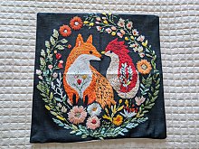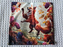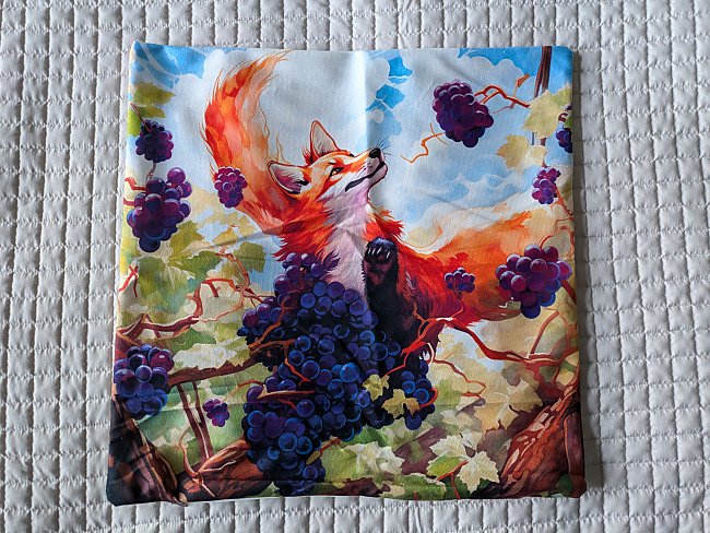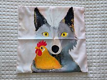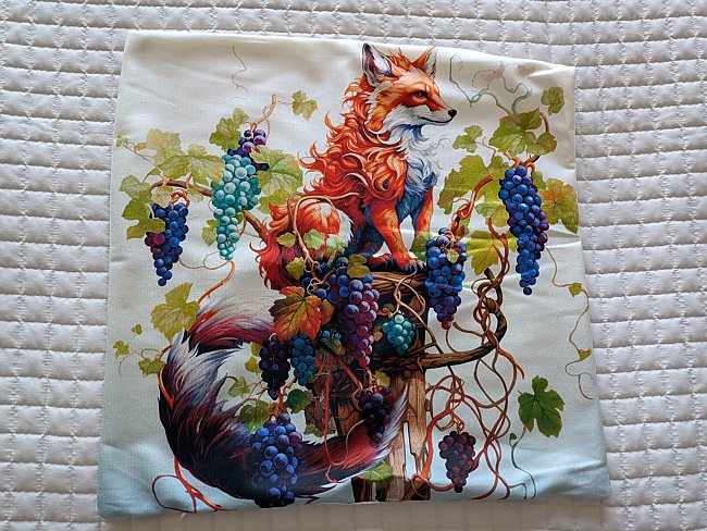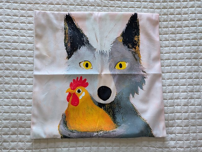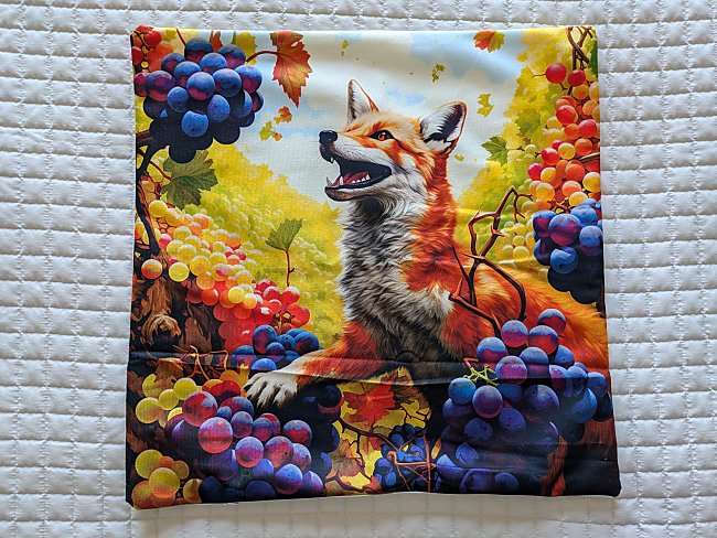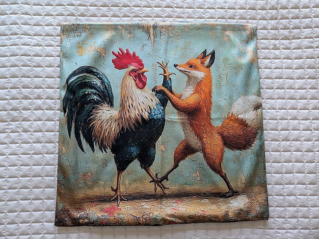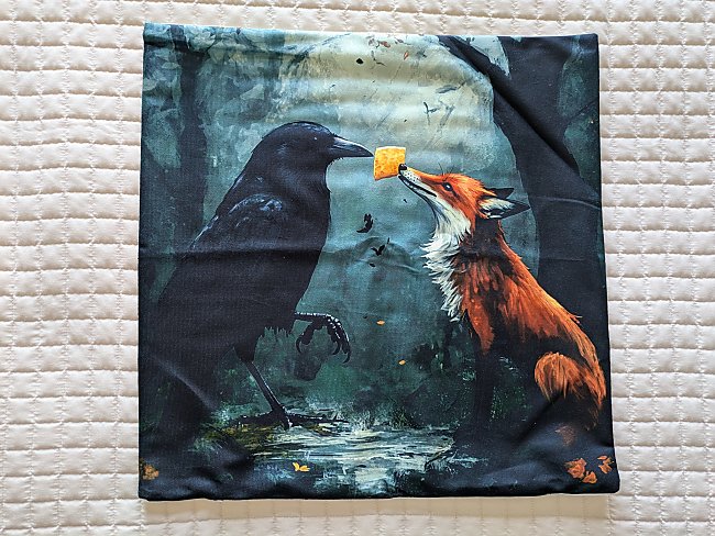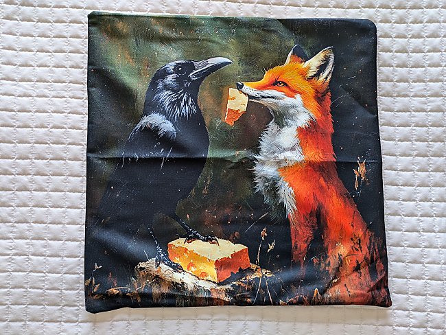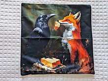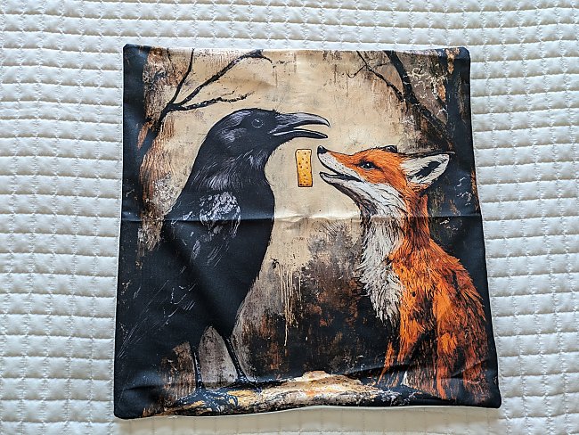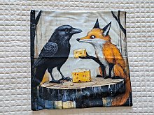 There is something strange about almost every member of this unusual set of pillow covers. Almost each cover illustrates characters from standard Aesop’s fables, but few get the relationship of the characters right. The fox sits in the midst of grapes here while the fable has him unable and even trying in vain to get them. The fable has the cheese in the crow's beak, and the fox cleverly gets the crow to sing. Here they share cheese or -- perhaps in a deliberate parody -- the fox offers the crow a piece of cheese! Further, what is the fox doing with rooster's claws rather than fox's paws?