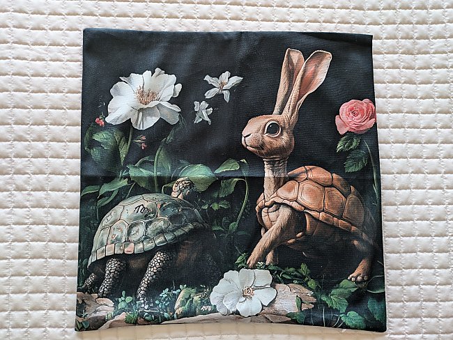 2022? Twelve pillow covers illustrating a variety of fable characters. 18” x 18”. Made in China. $7.50 each through Joshua Jacobovitz, Jan., ’25.
