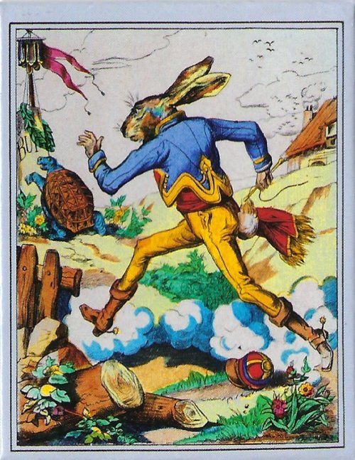 I am only beginning to learn that there is a significant market for refrigerator magnets! Here are three magnets with lovely representation of presumably older, traditional fable illustrations. That these exist was a pleasant surprise to me; that there are many other refrigerator magnets was another surprise! Now I need to find out where these traditional illustrations come from.